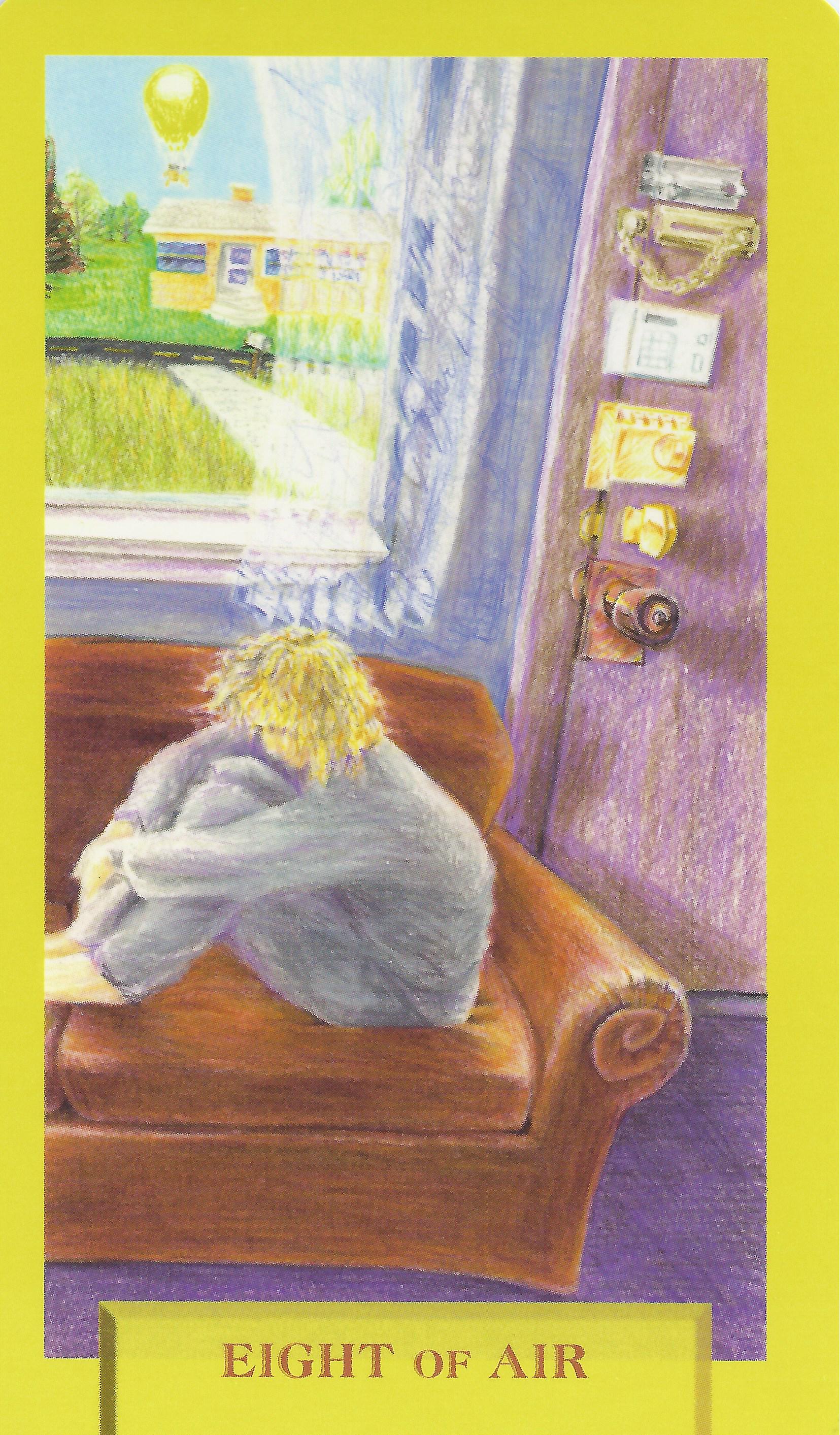 In the Eight of Fire the entire card is filled with images of fireworks. For many of us this is one of the largest displays of energy we will ever see. The intensity of the Seven has increased many times. It is a chance to utilize that energy – seize the moment – to accomplish great things now because this concentration of energy will quickly burn out. Recognizing the opportunity through all of the Fire Element’s chaotic power is still a challenge but it is time now to seize control and tame the wild beast. The Eight of Water shows an artist who has just completed a work and with his back to his painting, is putting away his tools. This card is about knowing when something is finished. The Eights offer accomplishment but the Water Element often makes us reluctant to let go to the point that little is accomplished. The artist has done all that he can do and he is satisfied with that aspect of his work – even if the work itself falls short. He knows when it is time to move on. There is no emotional attachment. The child from the Seven has grown up with emotional mastery. The Eight of Air shows a woman overcome by fear to the point that she has created a self-imposed prison. There are multiple locks on her door and she huddles up on a brown couch with no awareness of the world beyond her window. Fear and despair are accomplishments too. This woman has mastered the art of fear. Very few could do it better. The true mastery here is over the Air Element’s destructive thoughts, but first she must become aware of that option. The challenges of the Seven have left her confused and doubtful of her own ability to participate in life. This is not a solid foundation that anyone would want to endure. The Eight of Earth shows an artisan at work. He is a master jeweler who has honed his skill through hours of practice and hard work. The patience of the Seven has paid off and he now uses the Earth Element to create pieces of beauty. He has a career to be proud of that will sustain him throughout his life.