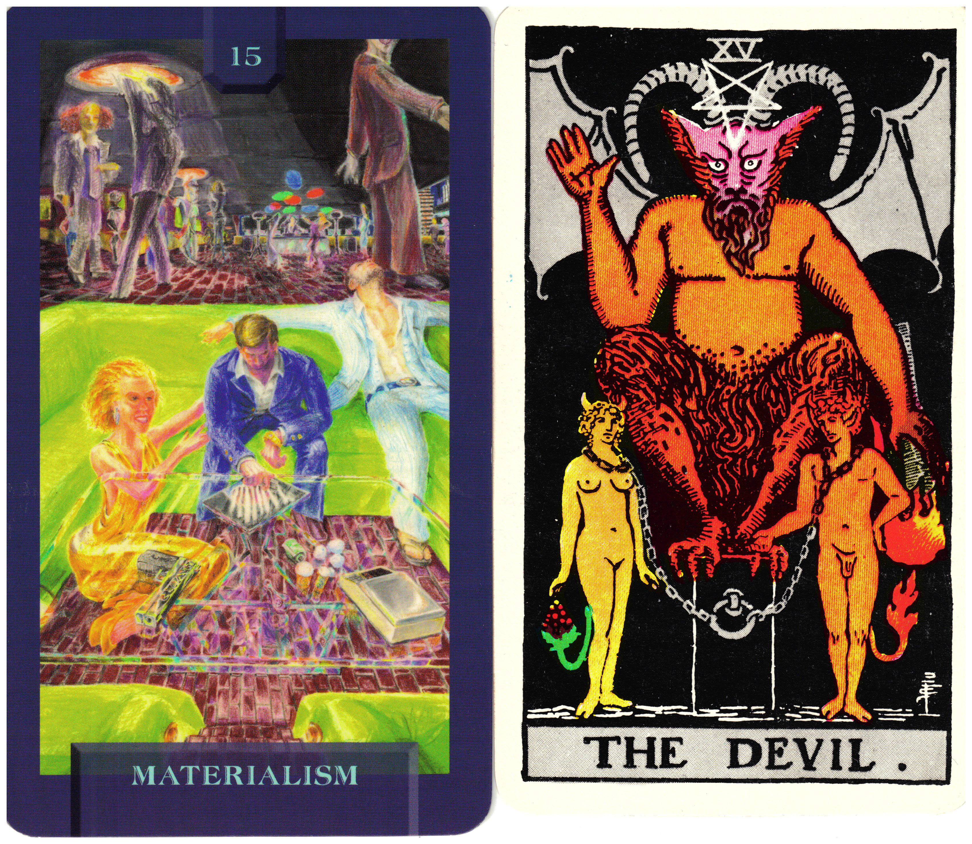 The Devil card is another of those cards that should be addressed right away when you are doing a reading. Even if the person you are reading for knows nothing about the Tarot – or maybe because they know nothing, a lot of assumptions are made when this card falls in front of them. It frightens them immediately. The Rider/Waite/Smith deck shows a rather imposing devil figure with ram’s horns, donkey ears, bat wings and clawed feet. His face is pink and his right arm is raised with the astrological glyph for Saturn in the palm – the planet of limitations. He is perched on a one-dimensional cube. There are two figures before him – a man and a woman – with cloven feet, horns and tails. They are chained loosely to the cube. This card’s symbolism suggests the perverse gratification humanity receives through material attainment rather than spiritual fulfillment. All evil in the world is enacted because somebody wants something someone else has – money, position, relationship, property, land, ideals, ideas, innocence, power. It is fueled by greed, jealously, desire, pleasure, escape, hate, or fear. Human beings are addicted to the material world. It is hard for us to identify with what we cannot experience with our senses – the spiritual. This addiction manifests on many levels but it is all tied to Materialism, Today’s Journey Tarot’s title for this card. Key 15 shows a party where the host is on a sofa preparing drugs for his guests – who are obviously in various stages of inebriation. It expresses the futility of excessive gratification in modern terms that we can all understand at a glance.