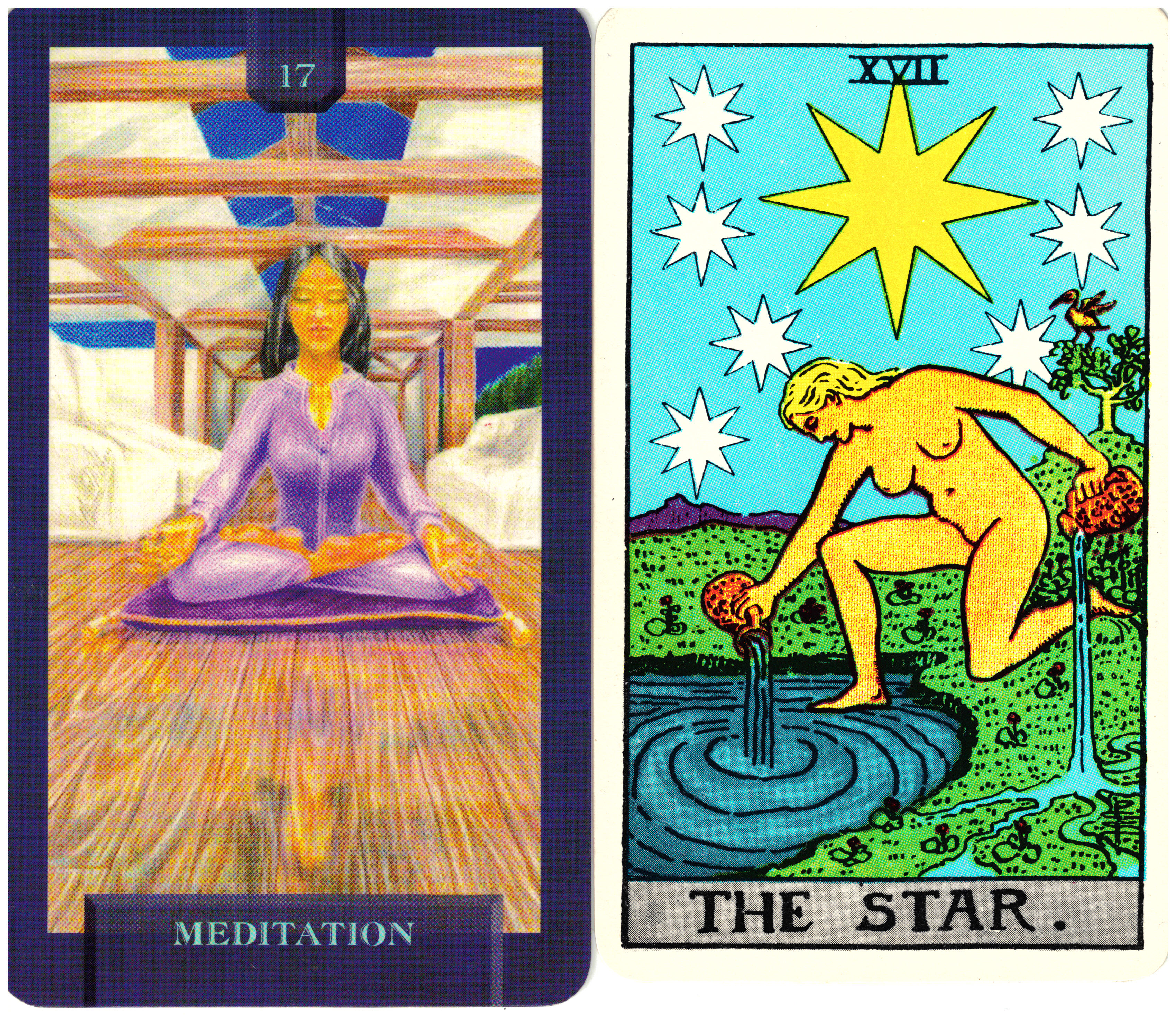 The Star card in the Rider/Waite/Smith deck is one of the most beautiful and inspiring of all the Major Arcana. It shows a kneeling woman with one foot in a pool of water and one on land. She pours water from two pitchers, one in each hand – one into the water and one onto the land. There is a large eight pointed star above her with seven smaller stars surrounding it. While this is a beautiful picture, the symbolism here is not apparent without further study. It is a card that inspires us to develop inner calm and peace. The card suggests that through this development we will find access to divine guidance. The Star is often referred to as the card of meditation. So, Today’s Journey Tarot simplified the symbolism to show a woman in a classic meditation pose and the card is titled, Meditation.