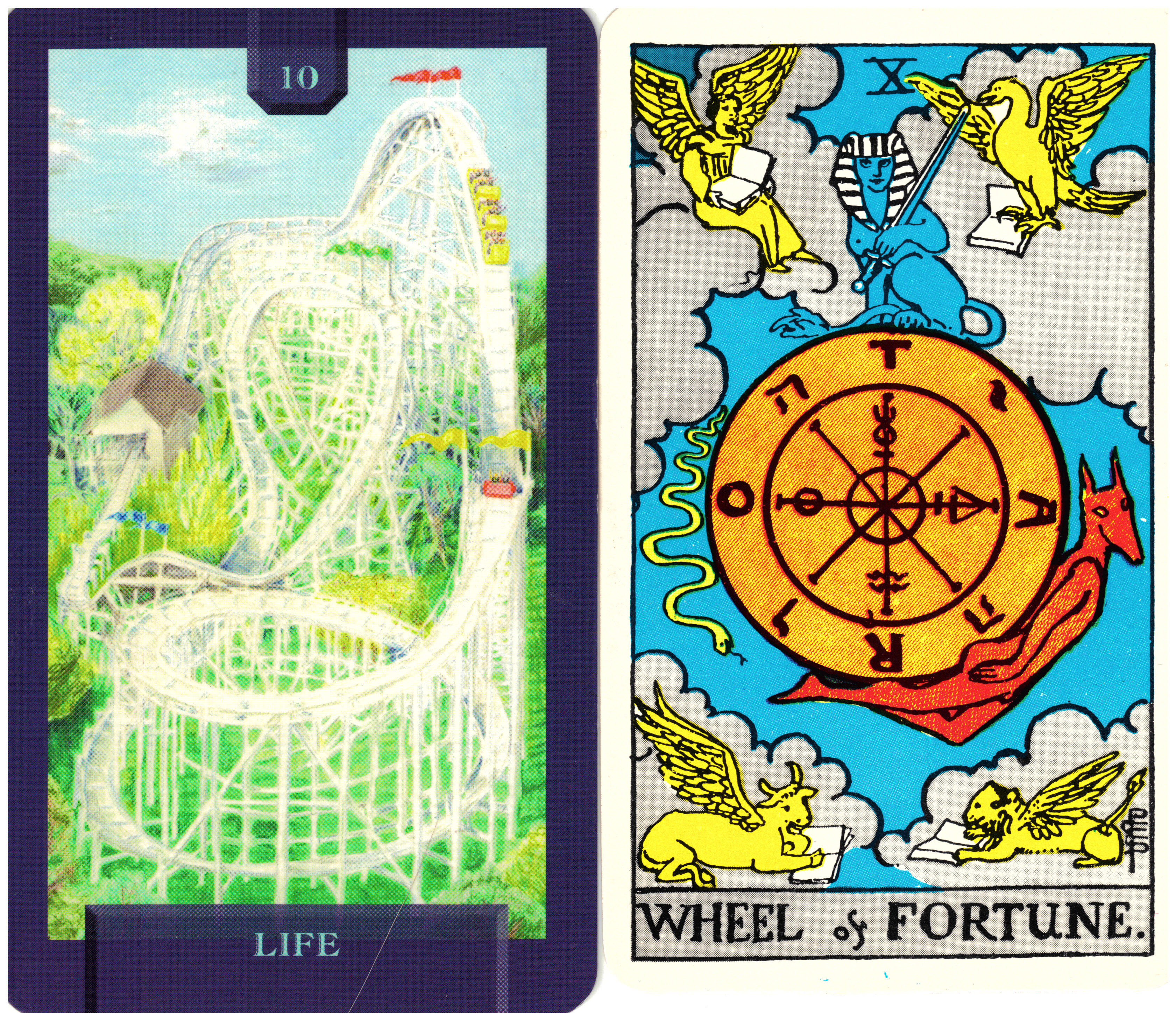 The Wheel of Fortune represents the endless cycle of life and the ups and downs of life. The Rider/Waite/Smith deck’s Wheel is an exercise in symbolism. The Wheel itself has three circles, symbols and letters. There are creatures adorning the wheel and at each corner of the card. At first glance this card is very difficult to decipher. You have to understand at least part of the symbolism or memorize the meaning of the card, which is what I believe most people do. In Today’s Journey Tarot, this most difficult card has been replaced with Key 10 Life – which is what all the symbolism basically boils down to. The image is a roller coaster. It aptly depicts the ups and downs of life as well as the cyclic nature of our existence. The riders on the roller coaster have no way off the ride so they are destined to continue traveling the loop and dealing with the twists and turns along the way.