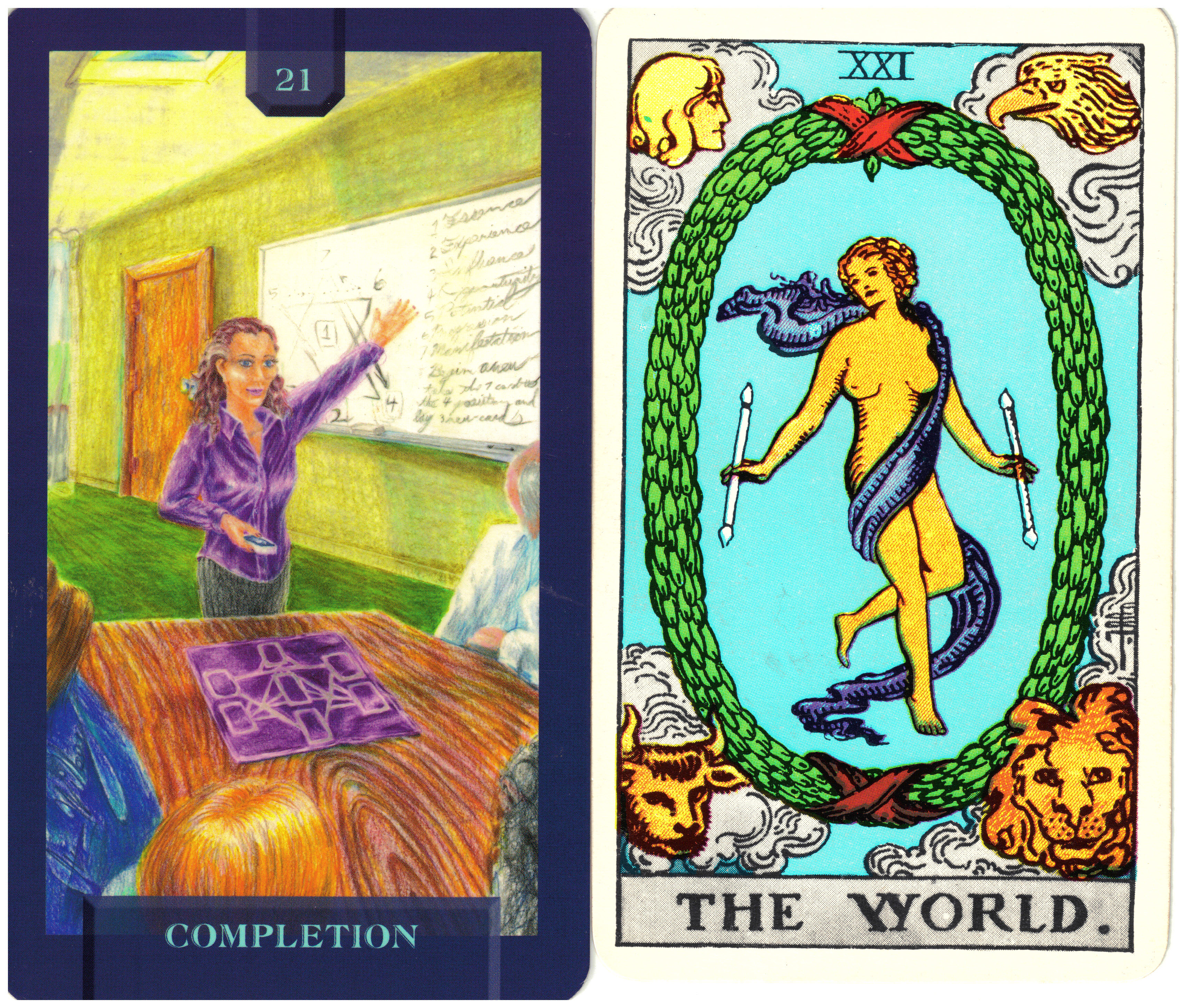 The World card is the completion of one cycle and the beginning of another. The Rider/Waite/Smith deck shows a nude figure, draped with a purple scarf. She is dancing in air within a green wreath. There are four figureheads at each corner (as in the Wheel of Fortune) representing, among other things, the four fixed signs of the zodiac. The symbolism here represents the idea that a celebration of attainment is at hand. We have passed certain initiations and will now move to future challenges on a higher level of development. Expanding Dimensions, the creators of Today’s Journey Tarot depict in Key 20 Completion, the same girl from card 0 Beginning. She is grown up now and is a Tarot reader and teacher. Whatever she has learned in her journey with the Tarot, the next level for her – and for us – is to share her knowledge with others, thereby insuring her continued development as well.