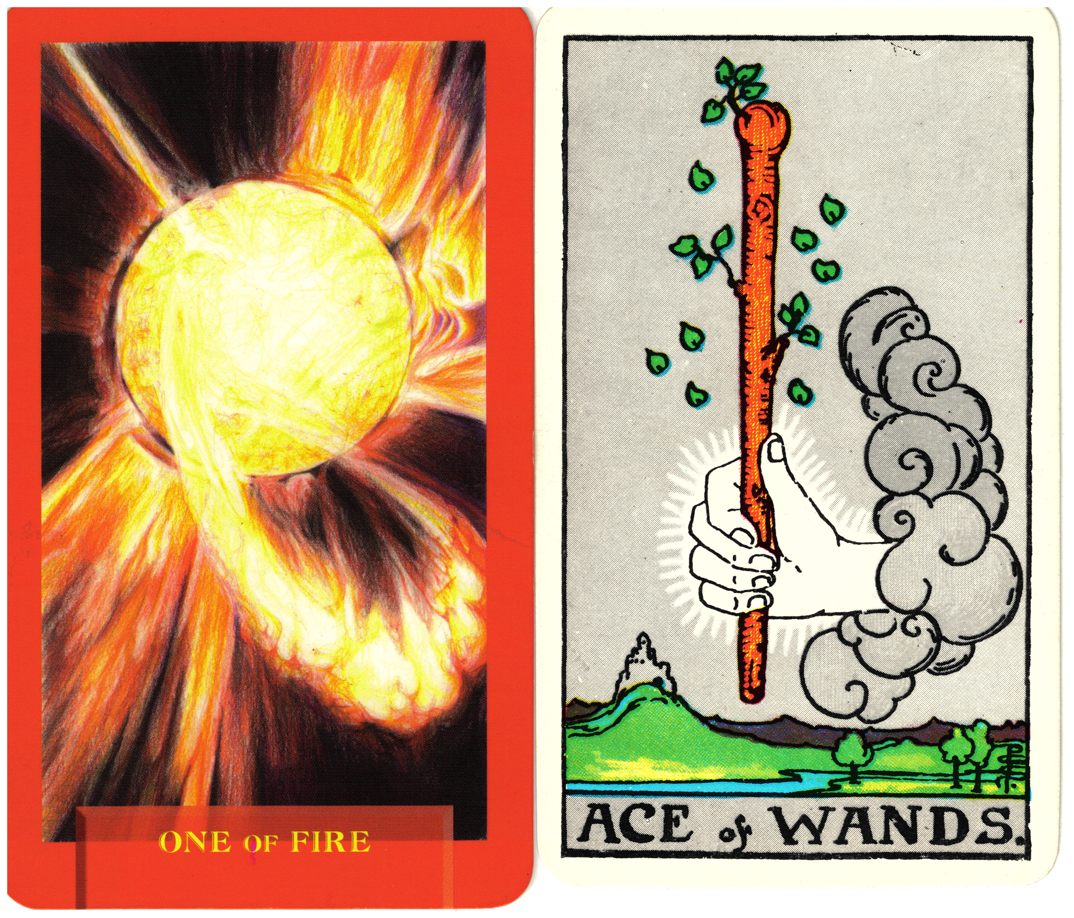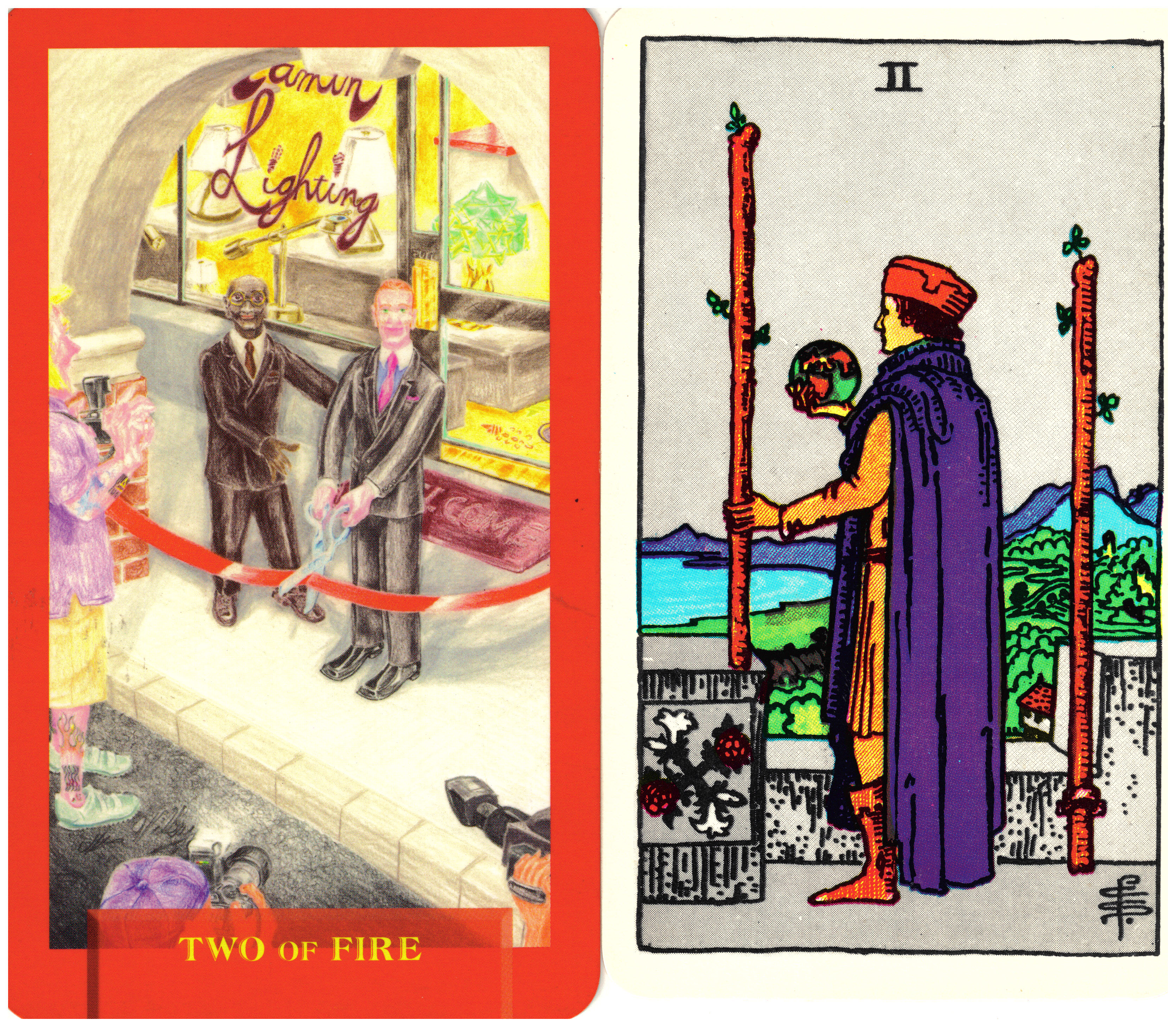 The Two of Wands from the Rider/Waite/Smith deck shows a richly dressed man holding a globe as he looks out to sea. It is a card of attainment of goals, achievement and success. The symbolism here is difficult to discern unless you are familiar with the meanings of the colors, the globe, the crisscrossed roses and lilies, etc. To modernize this concept in the Two of Fire, Expanding Dimensions, the authors of Today’s Journey Tarot chose to depict a ribbon cutting ceremony for a new lighting business. The lighting emphasizes the fire element of the card – the energy behind the success. Since this is the beginning of the business, the possibilities for future success are just beginning.
