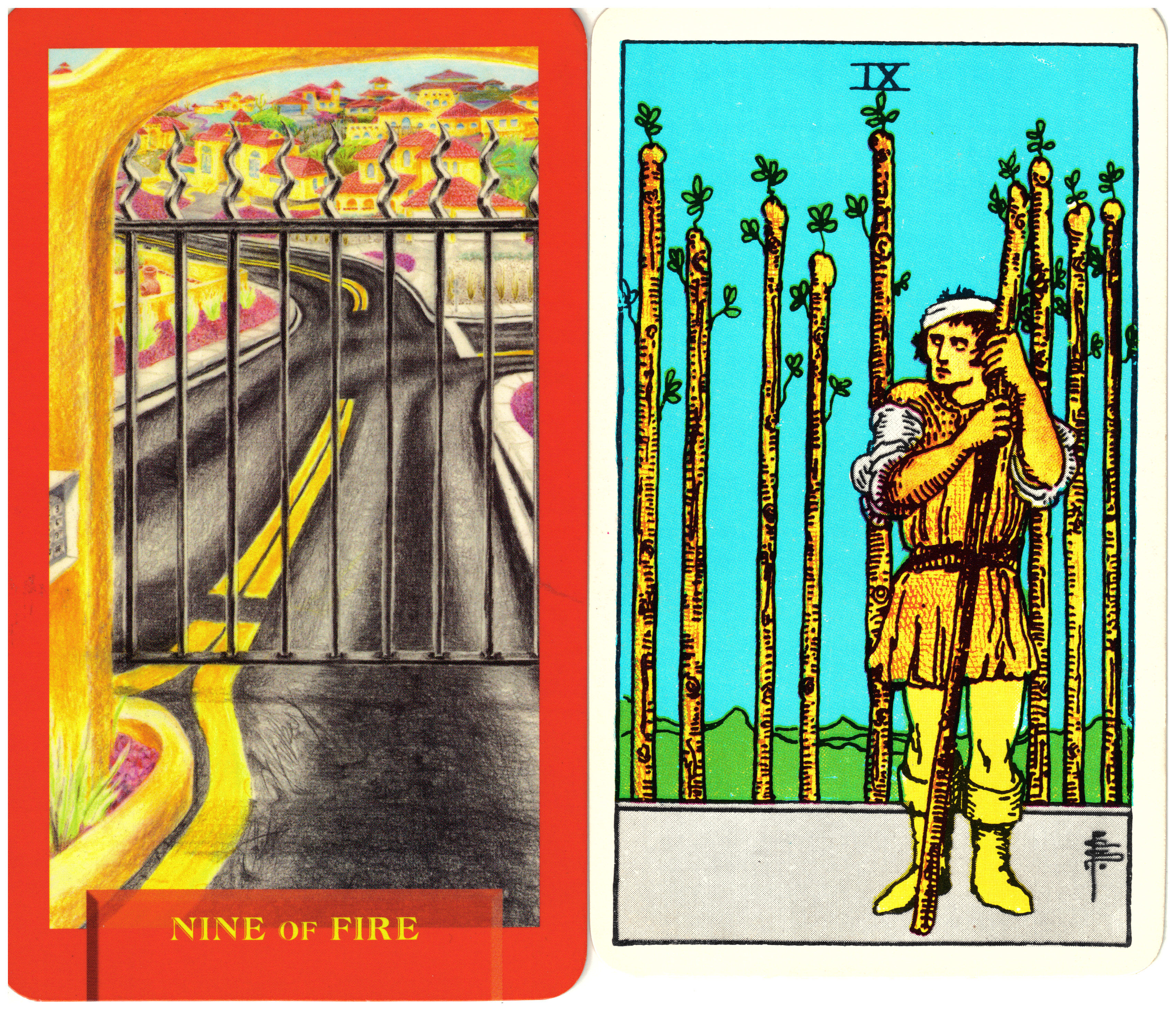 In the Nine of Wands a man has built a wall of Wands around himself for protection from his enemies. It is evident that he has recently been in a battle from the bandage on his head. There are all kinds of ways we can build walls around ourselves, but in modern society one of the things we do is live in protected or gated communities. The Nine of Fire from Today’s Journey Tarot shows one of these communities and the security it provides. But just like the Nine of Wands, it suggests that when security is traded for liberty, you will have neither. There is a difference between protection and isolation.