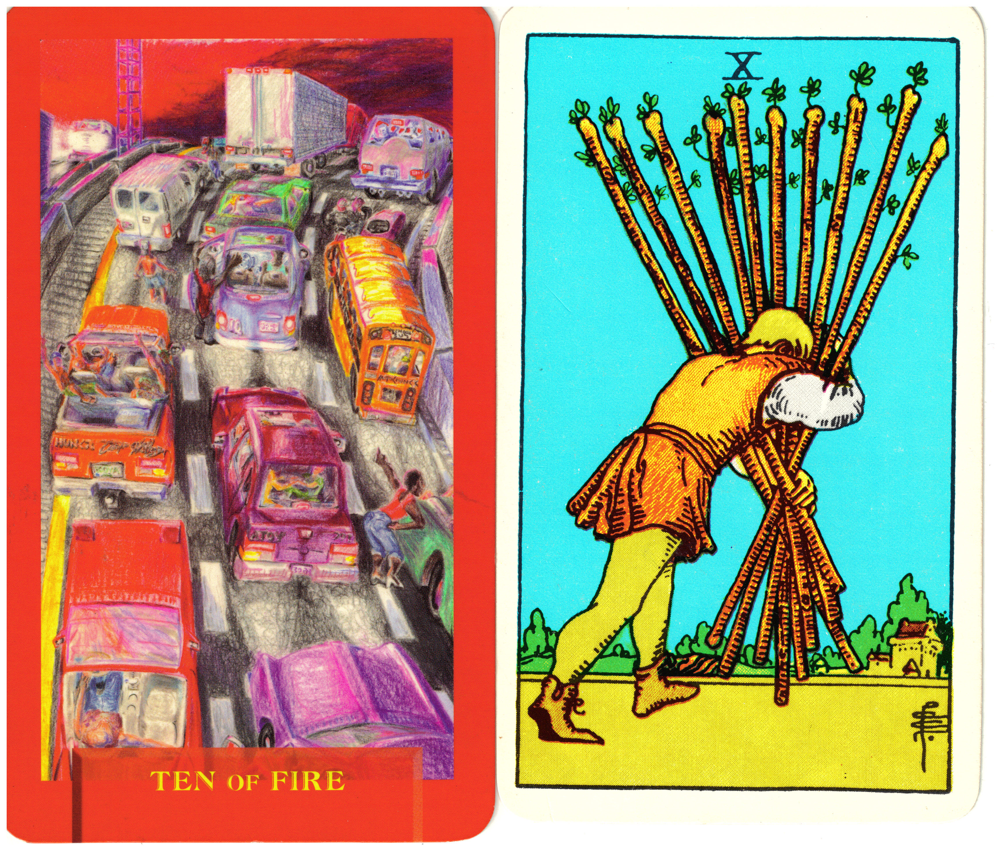 The Ten of Wands from the traditional Tarot shows a man carrying a heavy burden of wands. He is bent over from the load so that even his vision is blocked by them. We can understand from this image what is happening here. He is struggling with a heavy burden and unable to see the cause or the solution right now. The pressure is great. When Expanding Dimensions, the creators of Today’s Journey Tarot sought to modernize this concept, a traffic jam seemed the perfect representation. We have all been the victim of becoming stalled in traffic, not knowing what is going on, not knowing when it will clear. We have all become frustrated, perhaps even angry and agitated by the delay. Many things in life feel this way and it is up to us to wait until thing become clear and not allow the circumstances to create more tension in our lives.