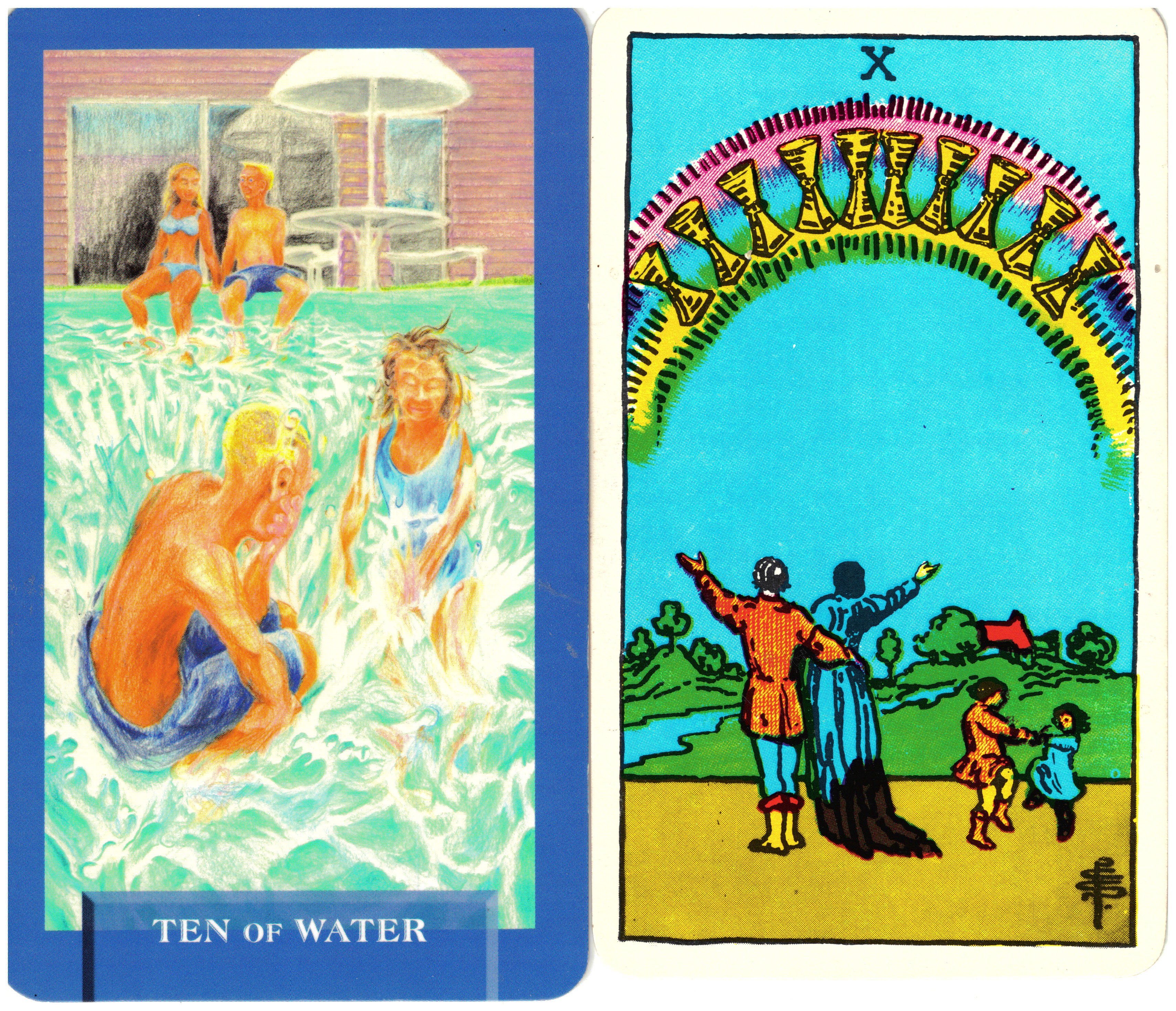 The Page of Cups is described as a spiritual child – sensitive, reflective and creative. The traditional Rider/Waite image of the Page shows a young courtier contemplating a blue fish emerging from a yellow cup. Without further study, this doesn’t really tell you very much about the Page. In Expanding Dimensions’ updated version of this card, the Child of Water, we see a child standing in a field of grass with his back to us. He has his guitar slung over his back and is reaching up to catch the very first drops of rain (water is the element of emotion). This is a child who is curious about his own feelings and approaches them with childlike wonder. Because he is a child, he is embarking on a wonderful discovery of his own emotional awakening through music. The yin/yang symbol on the guitar case is an expression of balance, indicating that music is a constructive outlet for his blossoming emotions.