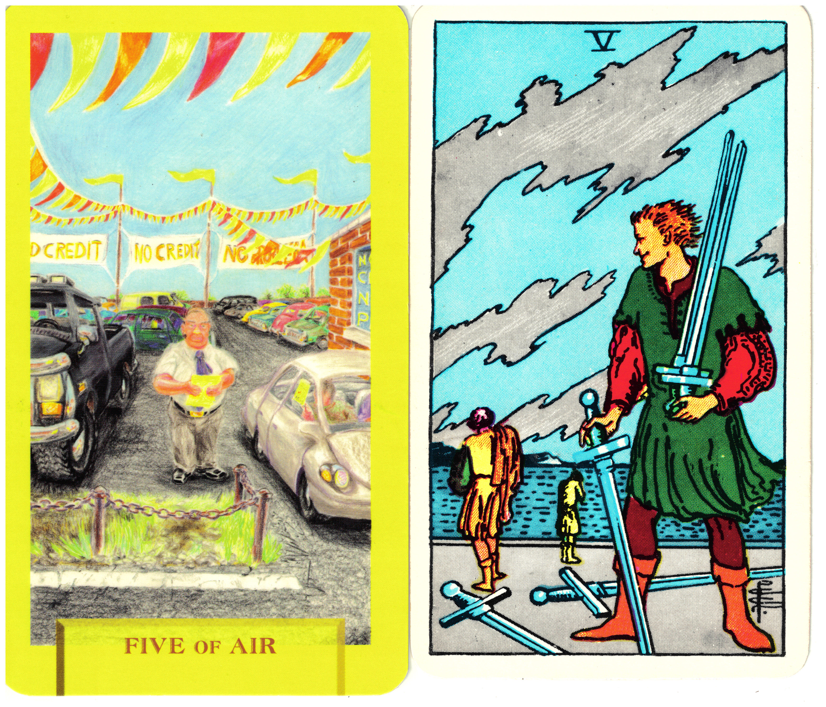 The Five of Swords is a card about winning through the deception of others. The traditional Rider/Waite/Smith deck shows a man gathering up the swords that were carelessly left behind after a battle. He did not defeat an enemy and win the swords honorably; rather he swoops in after the battle is over to scavenge for what is left. While technically not a thief perhaps, he is dishonest. In our modern society the stereotypical character that this scenario fits is the used car salesman who will say and do anything to make a sale. Today’s Journey Tarot’s Five of Air shows just such a man, after he’s made his sale. While it warns to beware of his dishonorable or disreputable transactions it also suggests that we are responsible for what is taken from us if we don’t pay attention.
