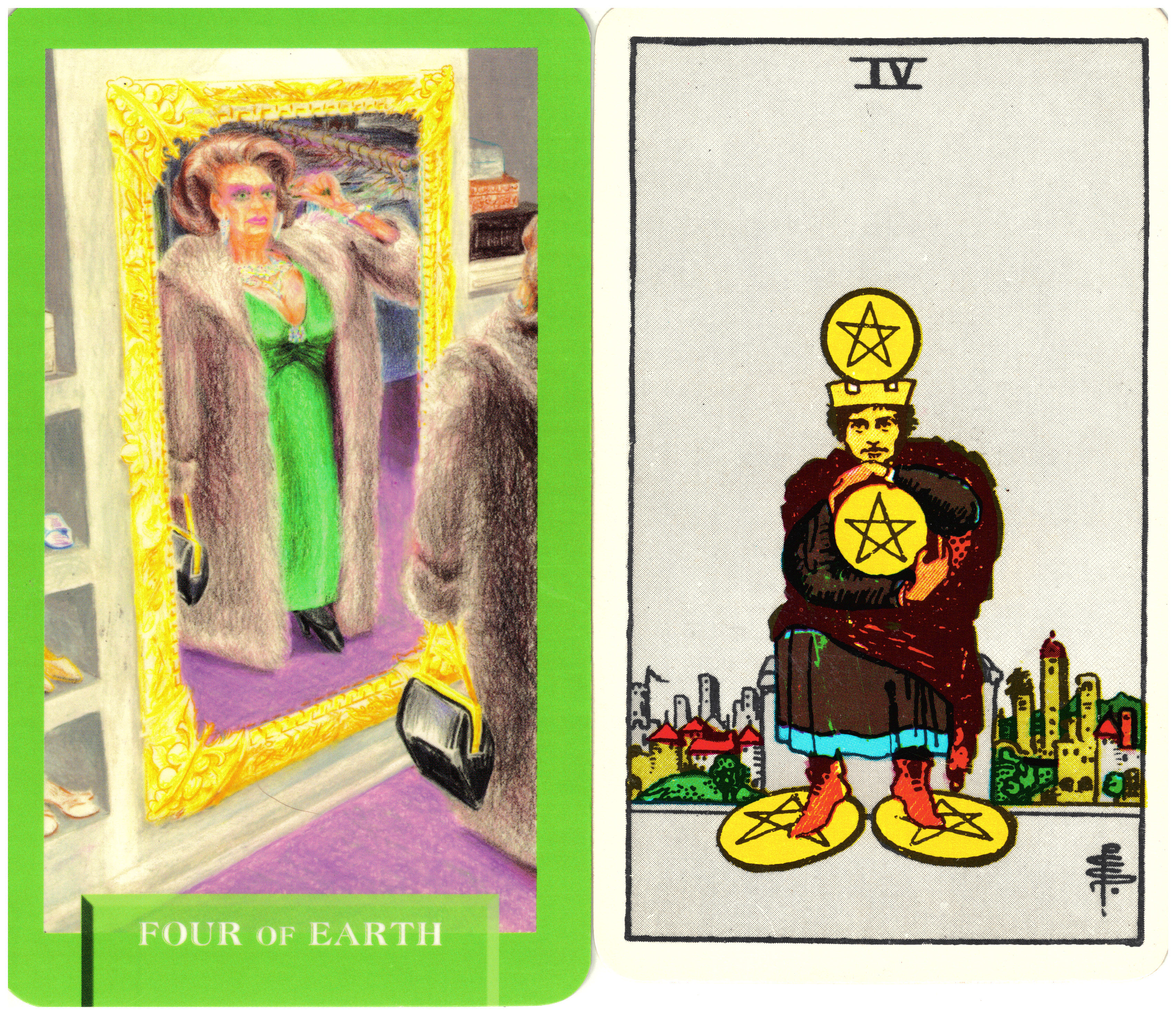The Four of Pentacles depicts a royal miser who is tightly hanging on to the four pentacles he possesses. One is balanced on his head, one he holds against his chest and the last two are tucked beneath his feet. This card is usually described as showing someone who is ungenerous and has an inability to share – money, attention, people, attitudes, energy, or position. Expanding Dimensions modernized this idea into the Four of Earth which shows an affluent woman admiring herself in a mirror. It suggests the same ideas as the Four of Pentacles: there is nothing wrong with material wealth as long as we remember to see beyond our own needs and do not hoard what we possess. The reflection the woman sees in the mirror is only her outward appearance – but that may be all she ever sees.