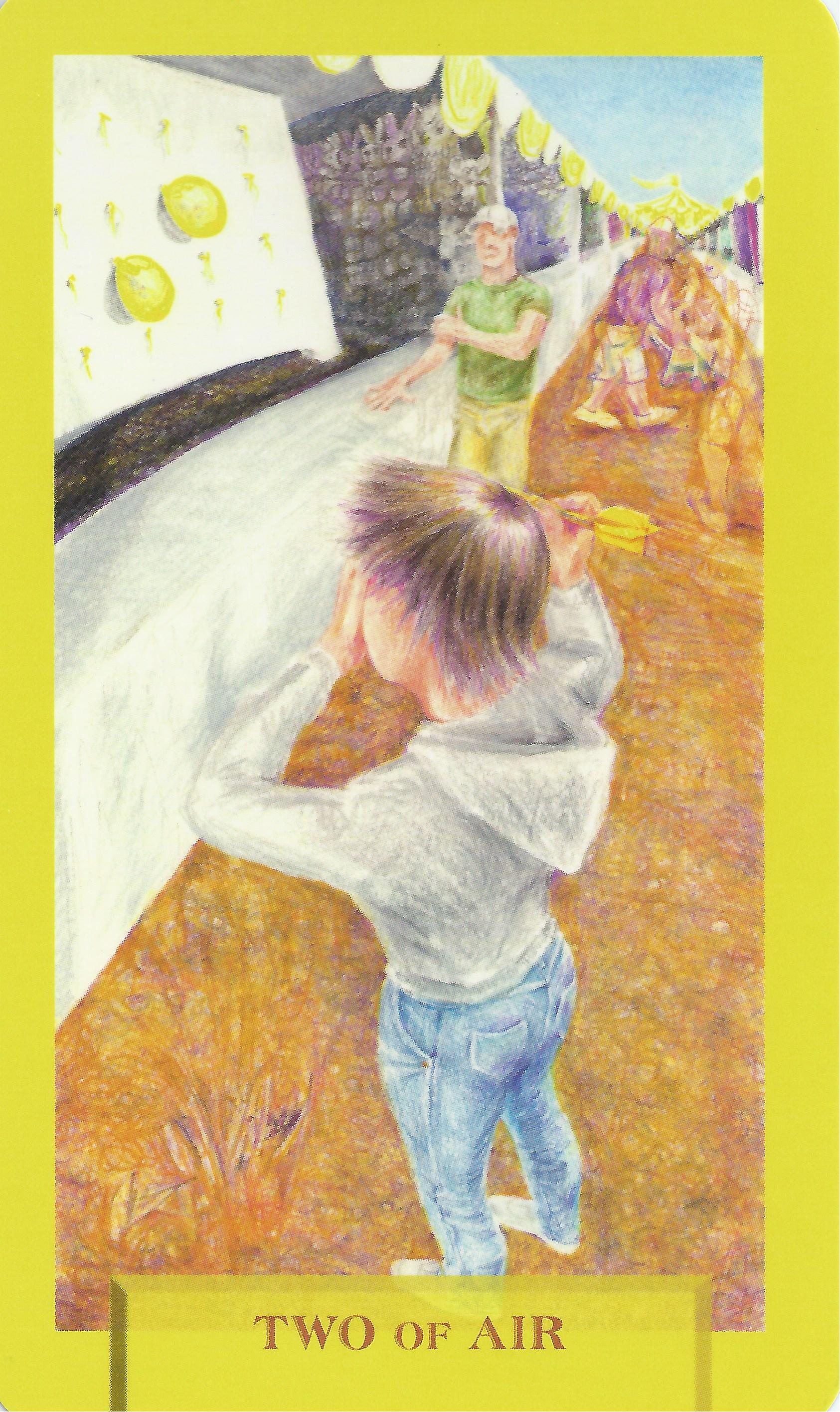 The traditional Eight of Pentacles shows a man seated at a workbench. He is chiseling a pentacle design on disks. The completed pentacles are mounted above him. This card is usually described as an apprentice working to master his skills. It symbolizes applying yourself creatively in a trade or business. The Eight of Earth from Today’s Journey Tarot demonstrates the effort, focus and concentration the jeweler uses to become successful in his craft. Expanding Dimensions, the creators of Today’s Journey Tarot used the colors of the chakras in the jewels on his workbench to indicate his spiritual nature as well, which allows creativity to flow through him.