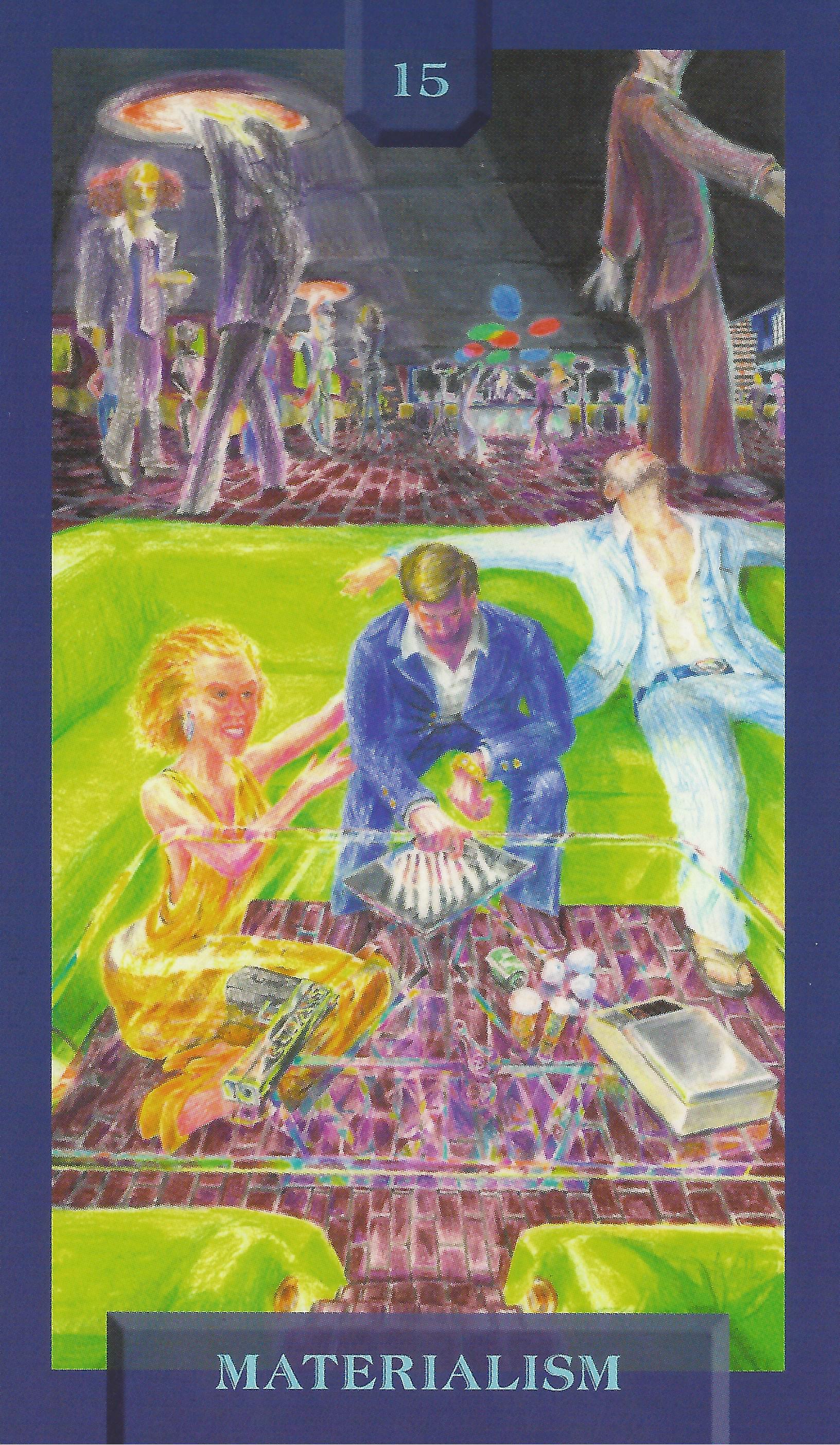 7-27-15 Today’s Tarot is Key 15 Materialism. Be aware of your interactions today. It is best to trust your own instincts rather than rely on what someone else tells you is true. This card is about illusion and deception.