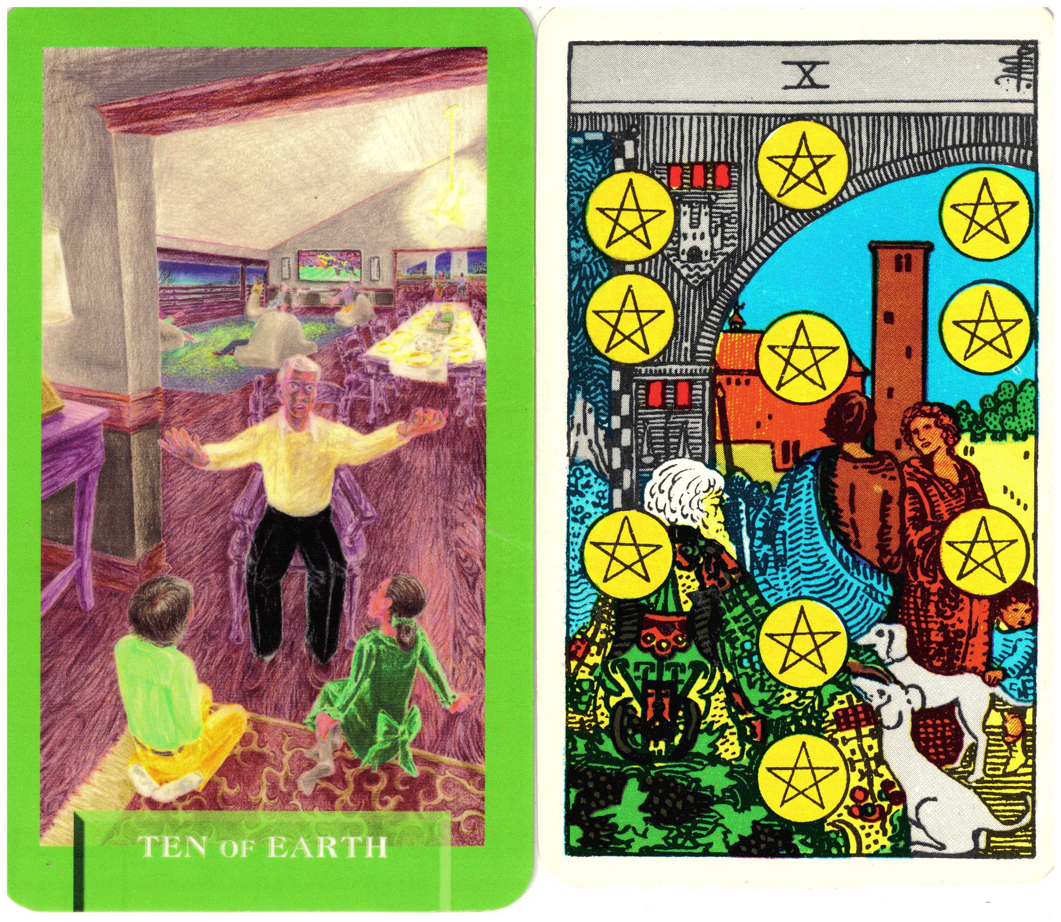 The Rider/Waite/Smith deck’s Ten of Pentacles is filled with symbols. We have an archway with a coat of arms, a checkerboard bordered tapestry, an old man, two adults, a child, and two dogs. The old man’s cloak is covered with grapes and magic symbols. His hair is white, but his beard is gold. He holds a wand in one hand and his other hand is touching the nose of one of the dogs. The female adult wears a red gown and the male a blue over cloak. The pentacles are arranged in a Tree of Life pattern. This card has to do with the legacy that is passed down from generation to generation through families. It could be material wealth, but also could represent the emotional and spiritual inheritance that moves through the circles of life. The child here is the only one paying attention to the old man. In Today’s Journey Tarot’s Ten of Earth, there is a grandfather telling stories to his grandchildren who are engrossed in his tales. Behind them other adults are busily preparing a family meal or engaged in other activities. The insight offered by the family legacy is the true bounty.